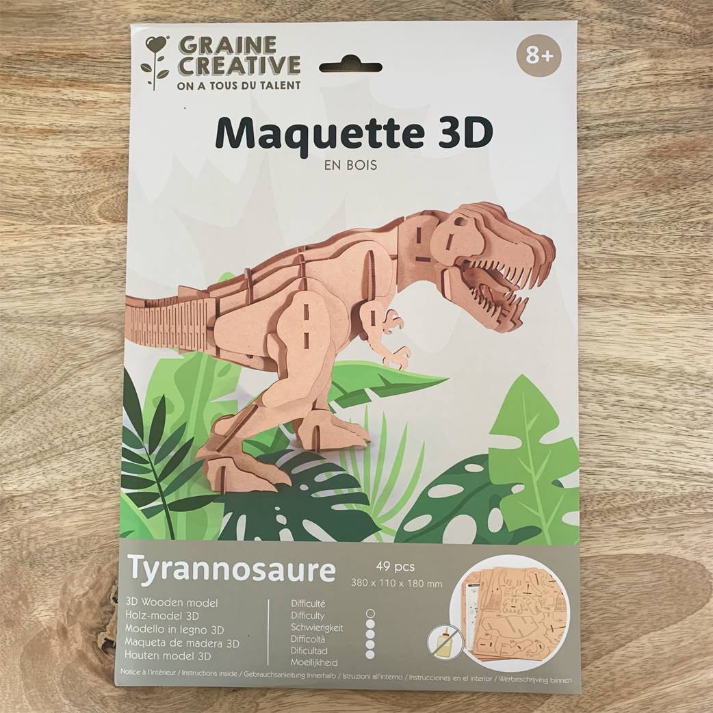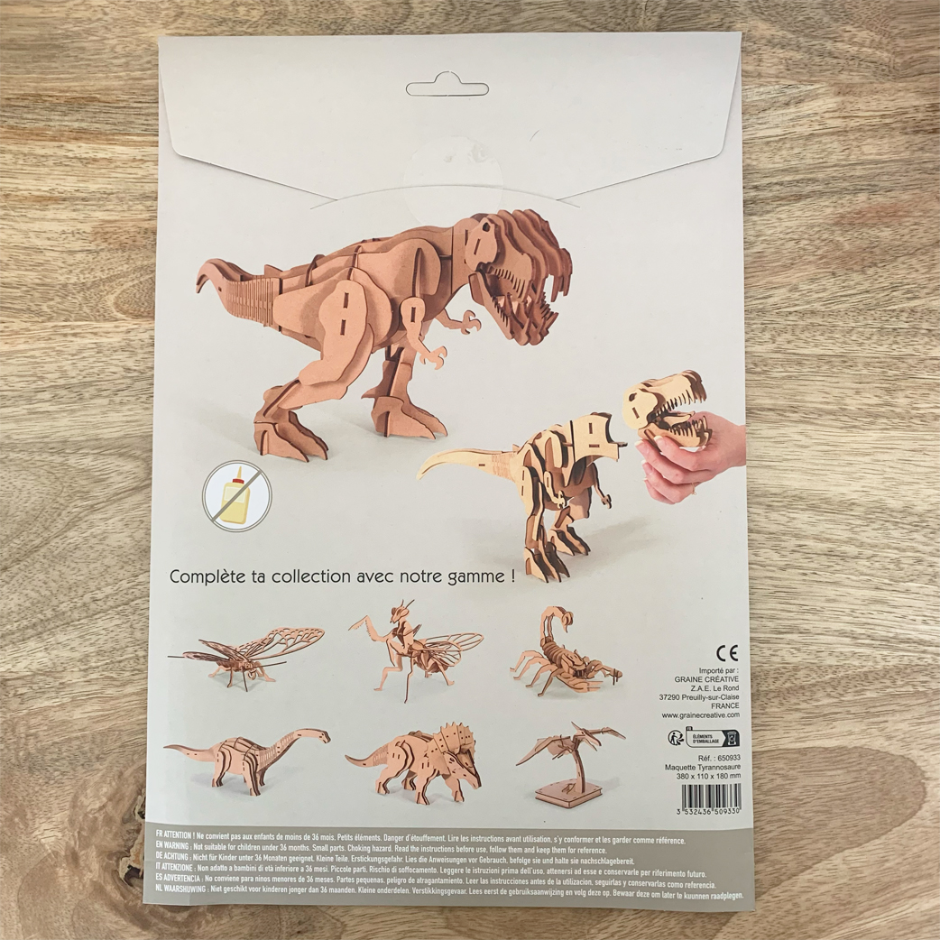 À base de bois, le tyrannosaure va prendre vie en 3D et pourra ensuite être customisé avec de la peinture, des paillettes …