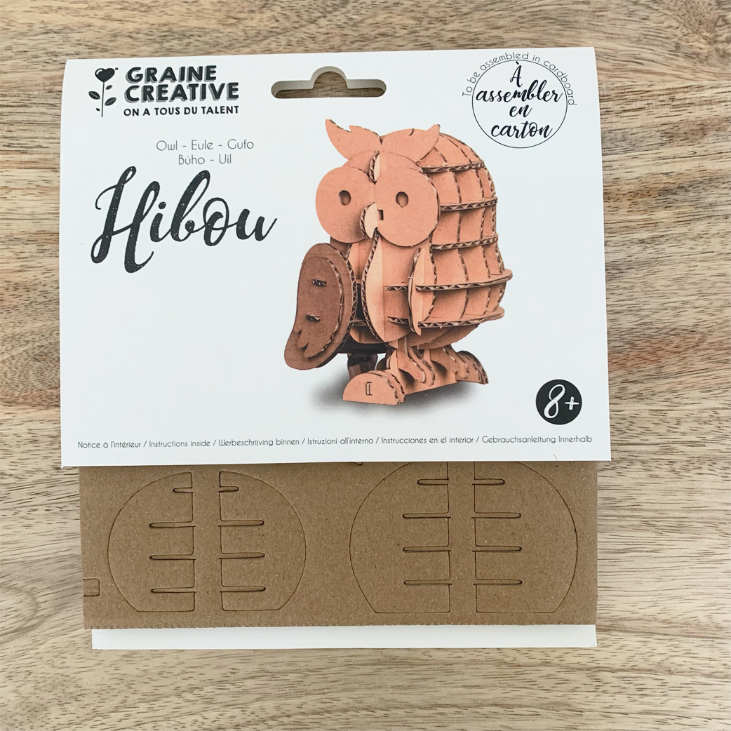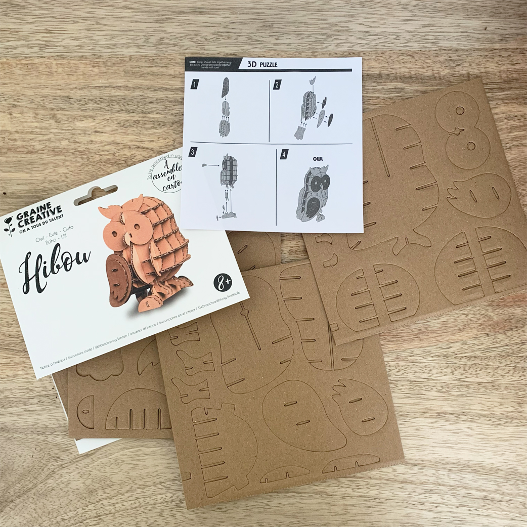 A base de carton, le petit hibou va prendre vie en 3D, il pourra ensuite être customisé avec de la peinture, des paillettes …