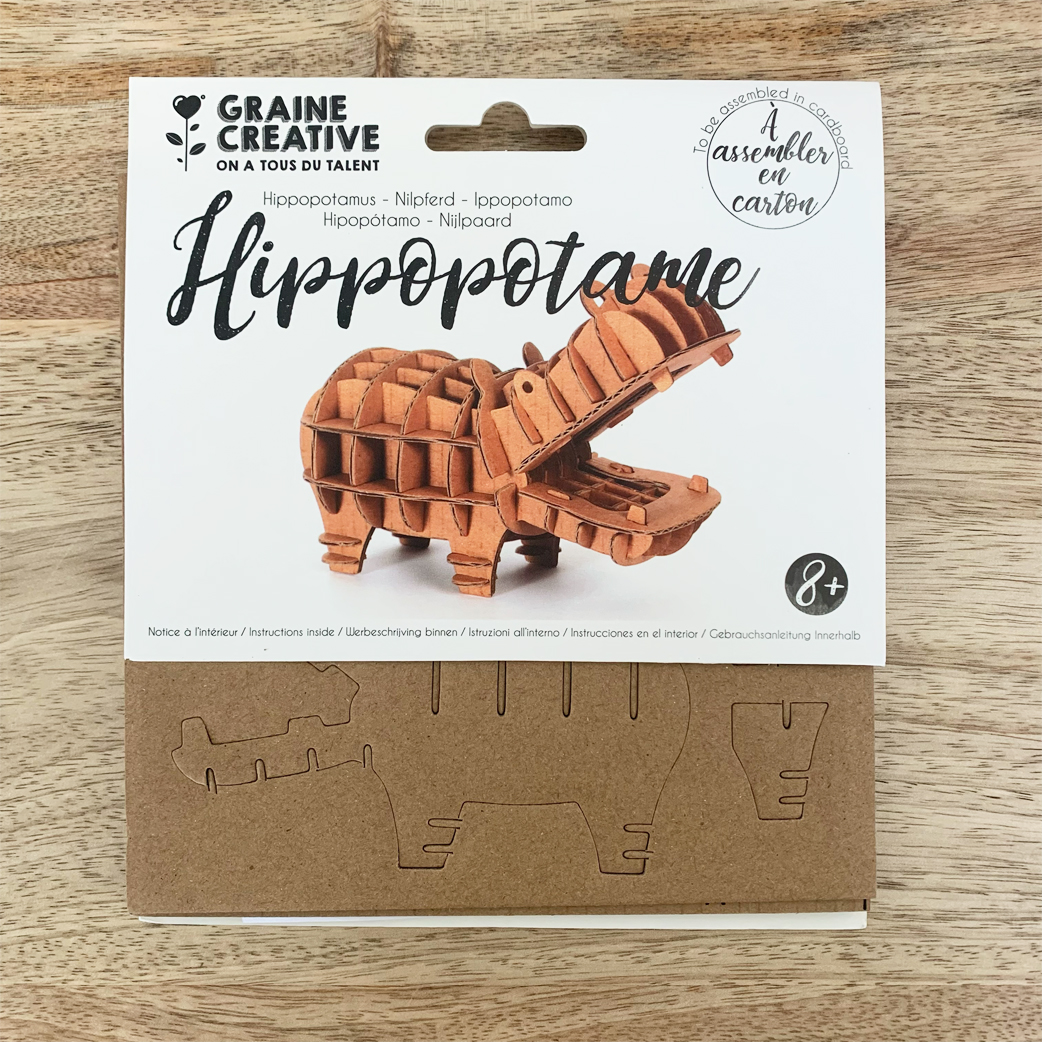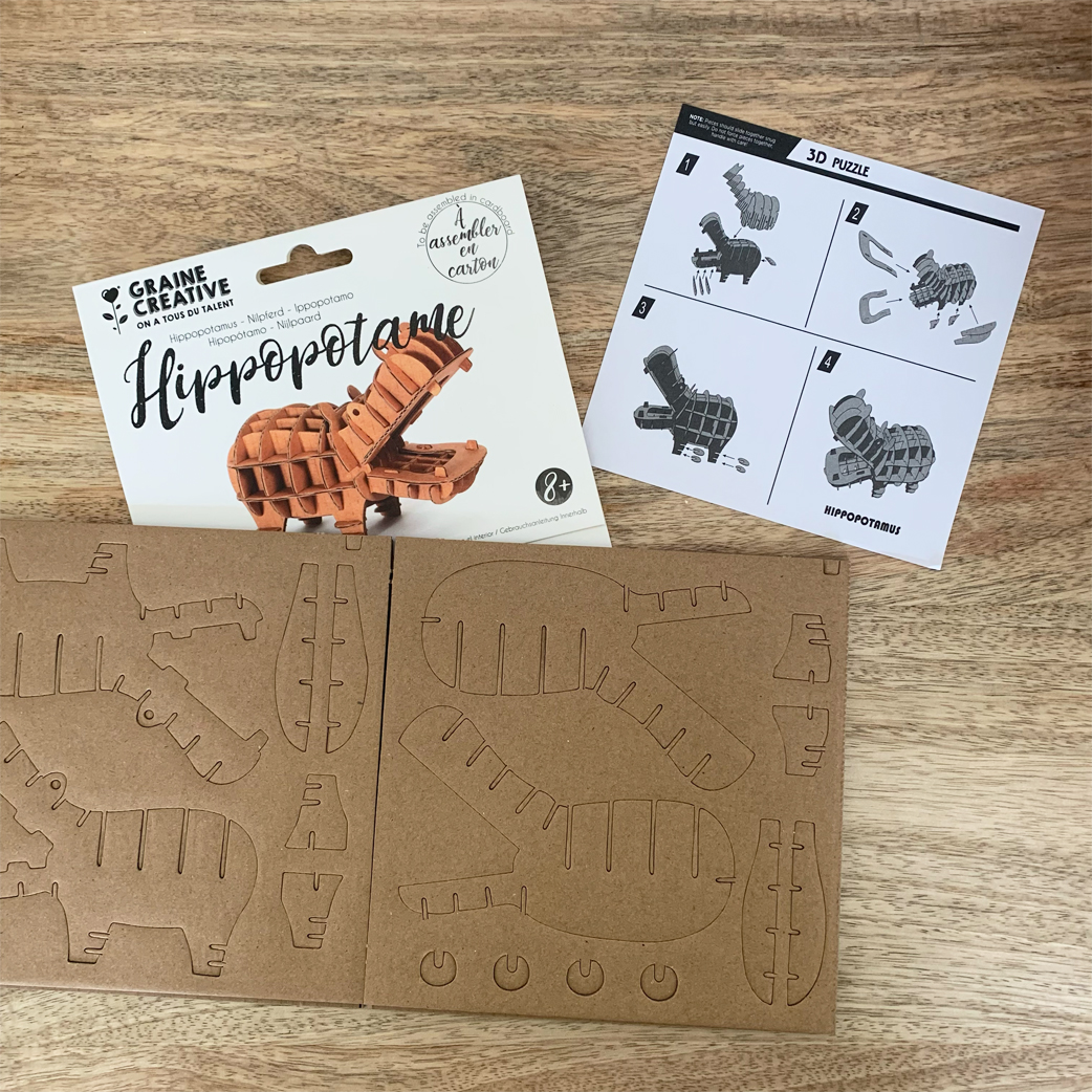 A base de carton, le petit hippopotame va prendre vie en 3D, il pourra ensuite être customisé avec de la peinture, des paillettes …