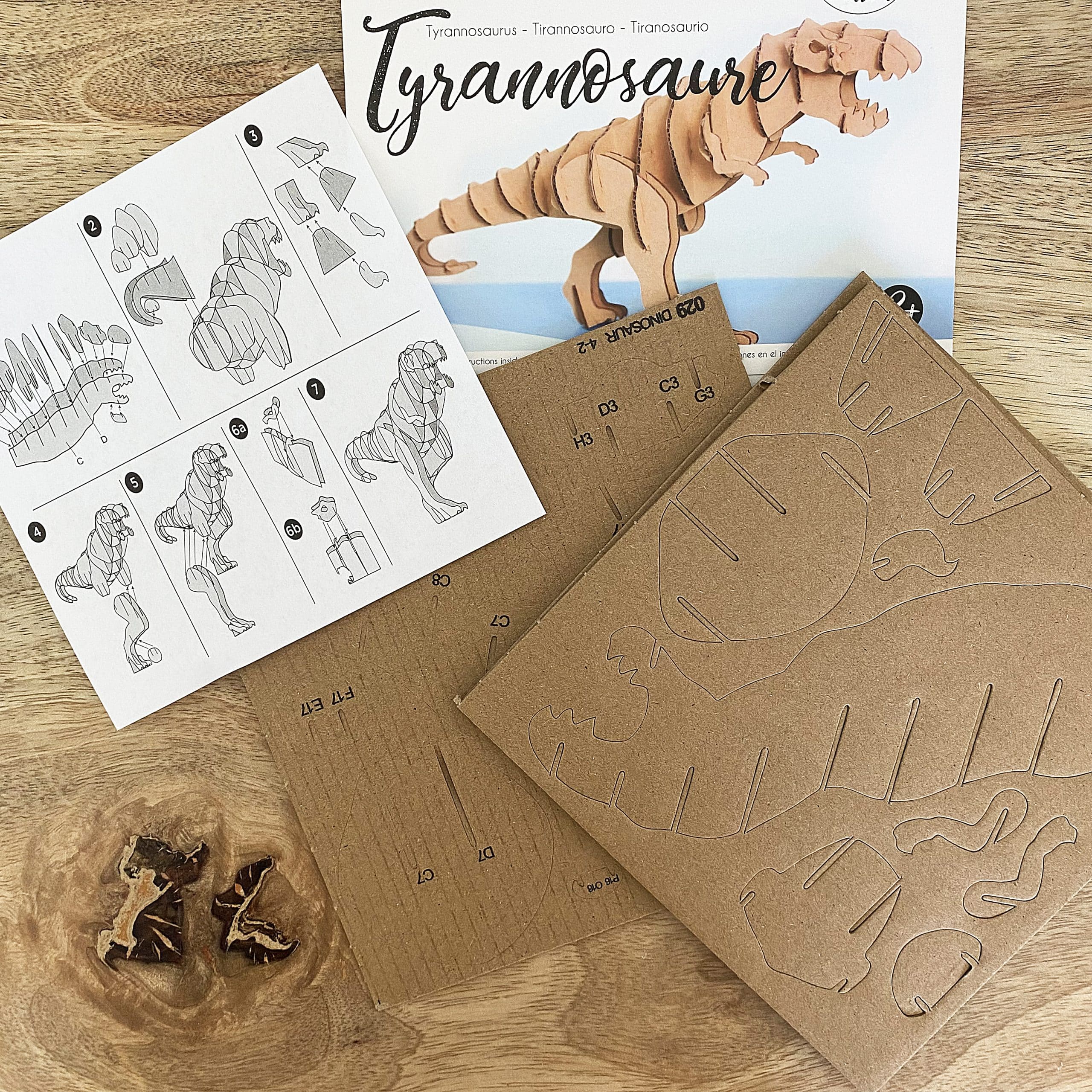 A base de carton, le tyrannosaure va prendre vie en 3D, il pourra ensuite être customisé avec de la peinture, des paillettes …