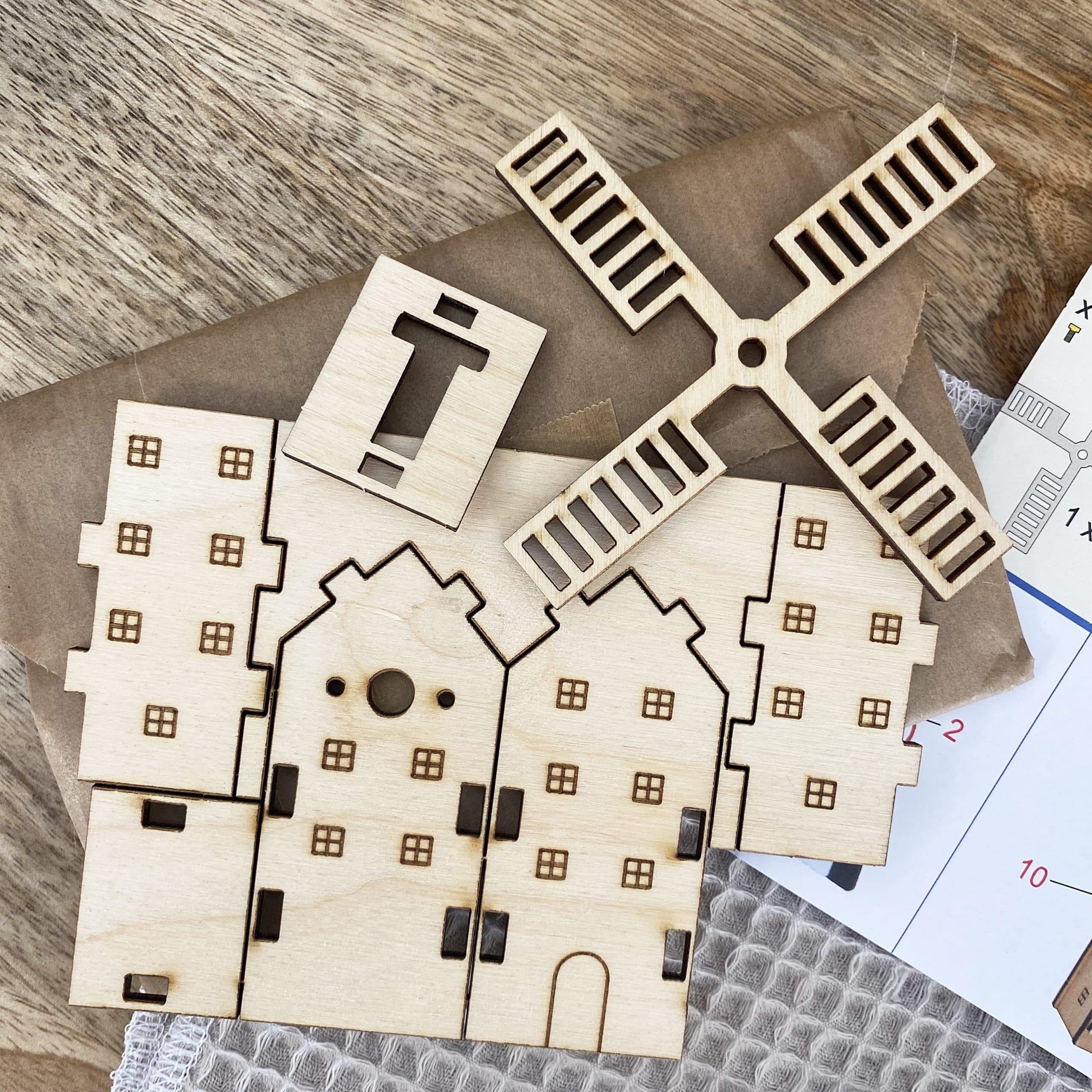 A base de bois, chaque pièce est préfabriquée pour une construction simple, sans colle, elle peut donc être maitrisée par les enfants.