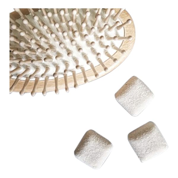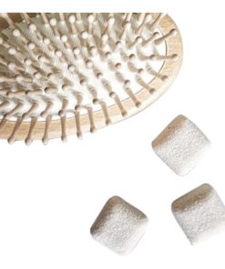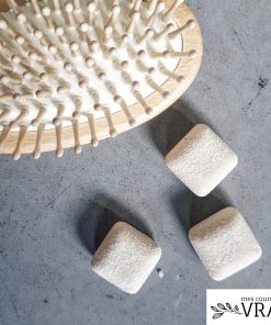 Ce masque pour cheveux solides est à la croisée entre le cosmétique solide et le DIY (faites-le vous-même). Pour l’utiliser il faut le mélanger à de l’eau afin d’obtenir une pâte à appliquer sur les cheveux. Pour chaque utilisation, il faut utiliser un petit galet.