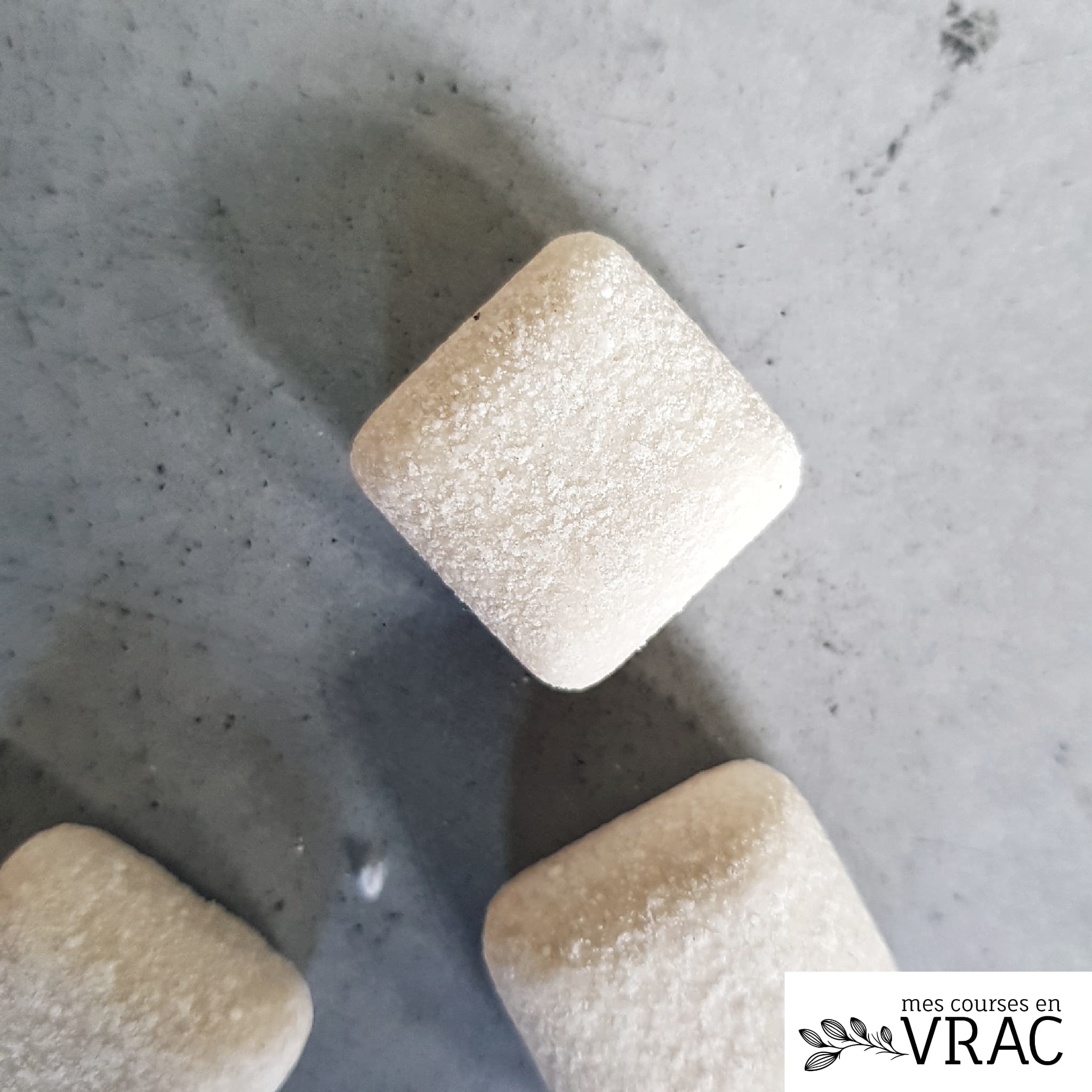 Tensioactif doux issu de la noix de coco, huile de noix de coco, gomme de guar, monoéster de polyglyceryl-3 et d’acide de son de riz, acide palmitique (acide gras), acide stéarique, extrait de noix de coco, bicarbonate de soude, acide citrique, poudre de grain de riz, amidon de riz, argile, inuline