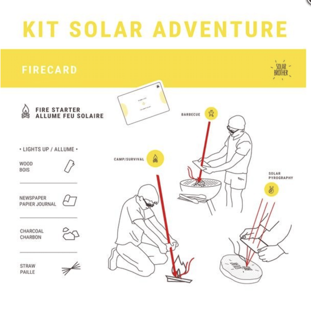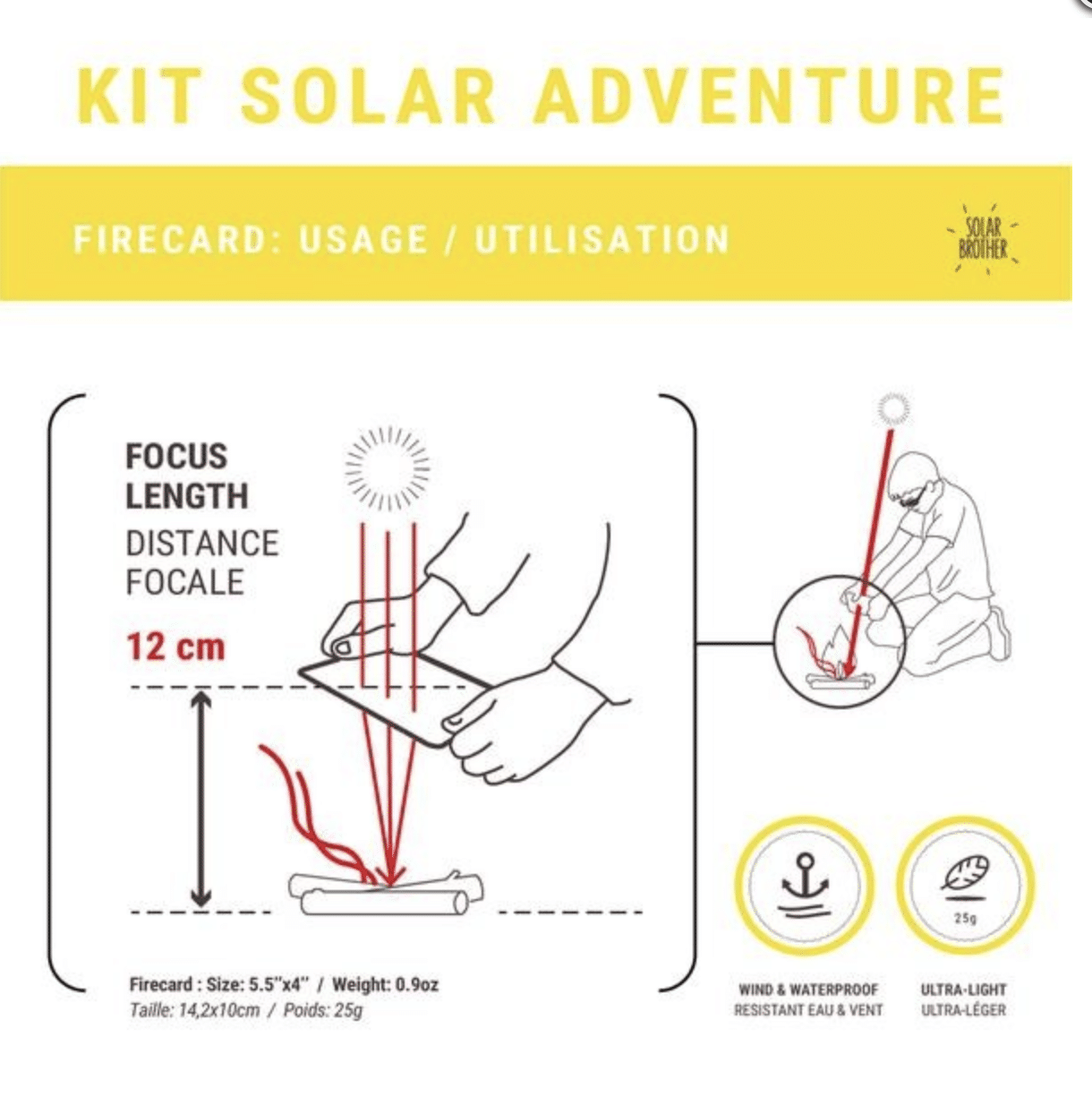 Un allume-feu simple et puissant FIRECARD. Les rayons se concentrent à travers la lentille et forment un point focal précis : l’allumage est instantané. Idéal pour démarrer un feu de camp, un barbecue ou faire de la pyrographie solaire ! Il résiste à l’eau et au vent. Vous pourrez même réaliser des pyrogravures sur bois ou sur cuir.