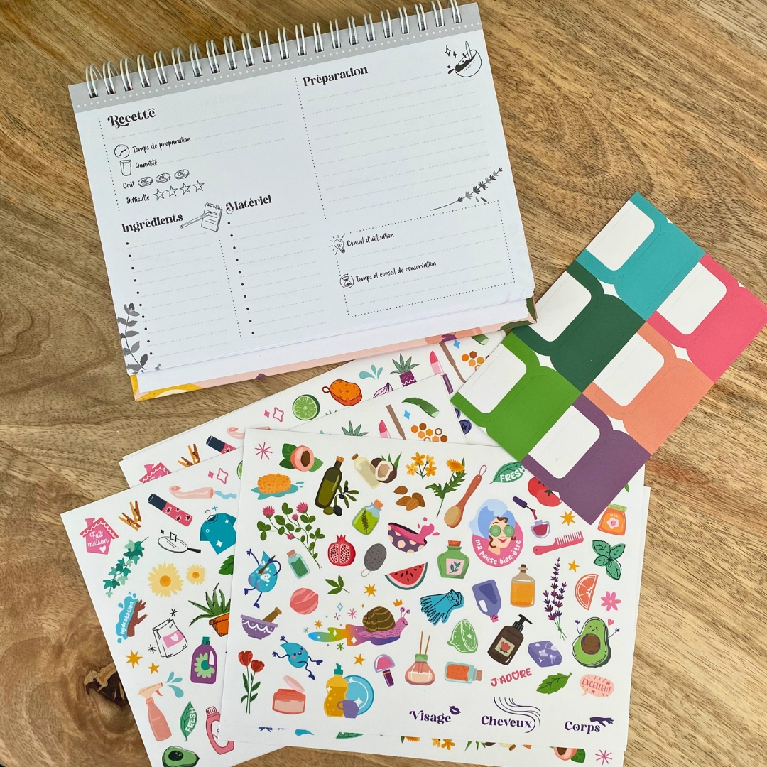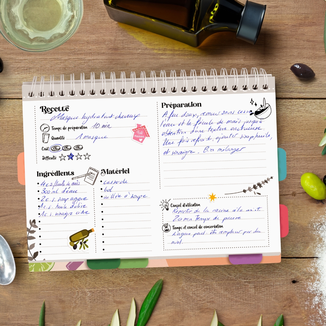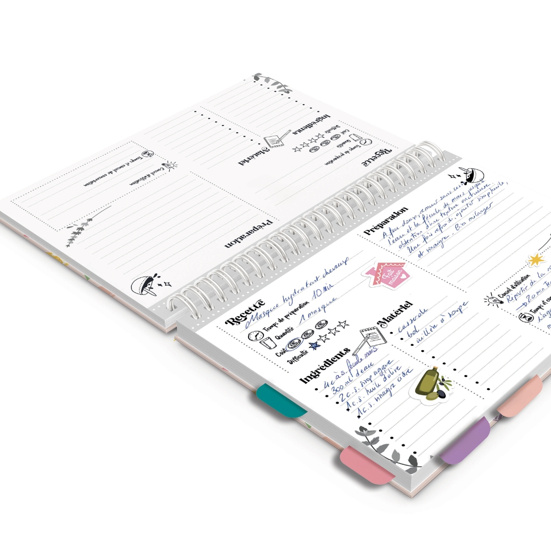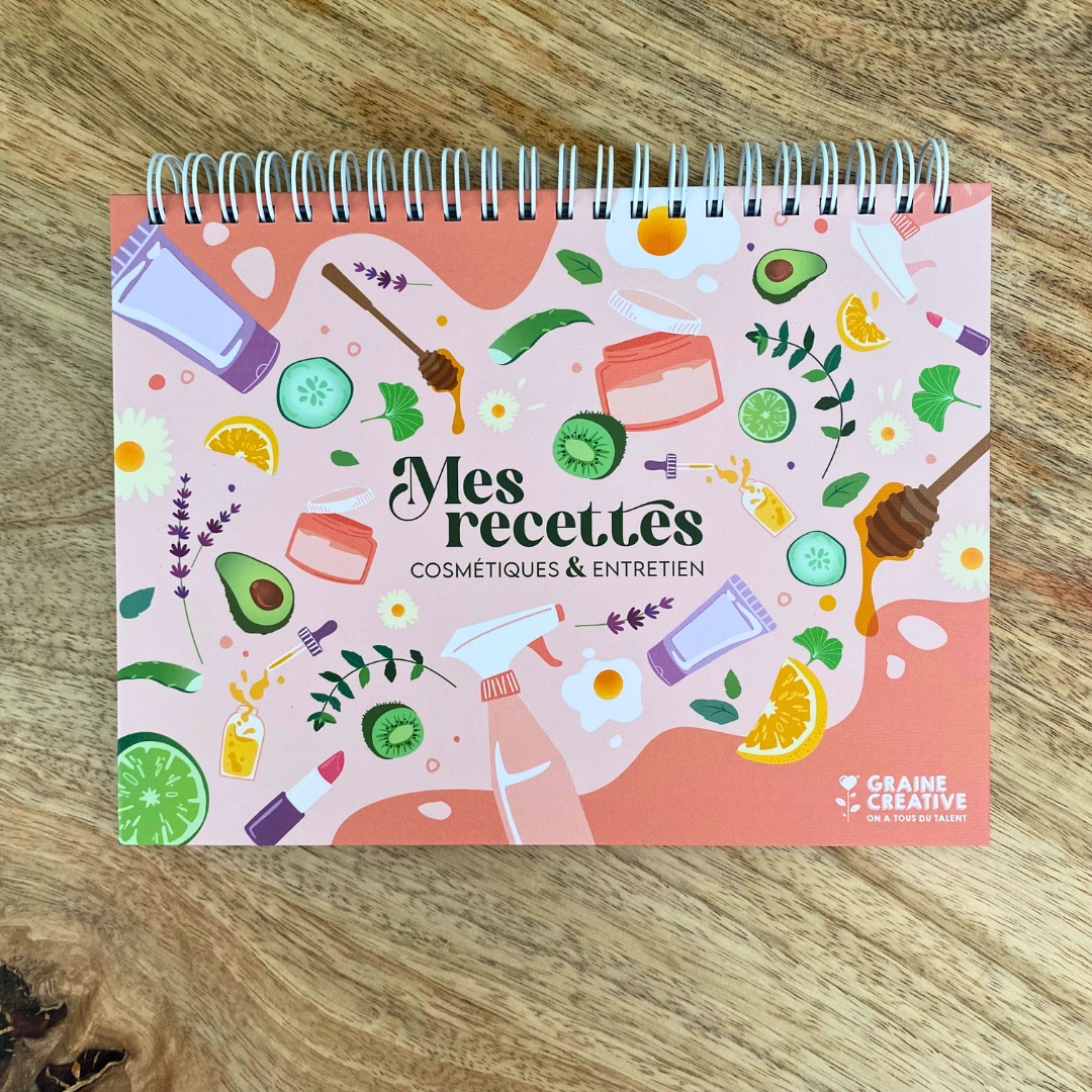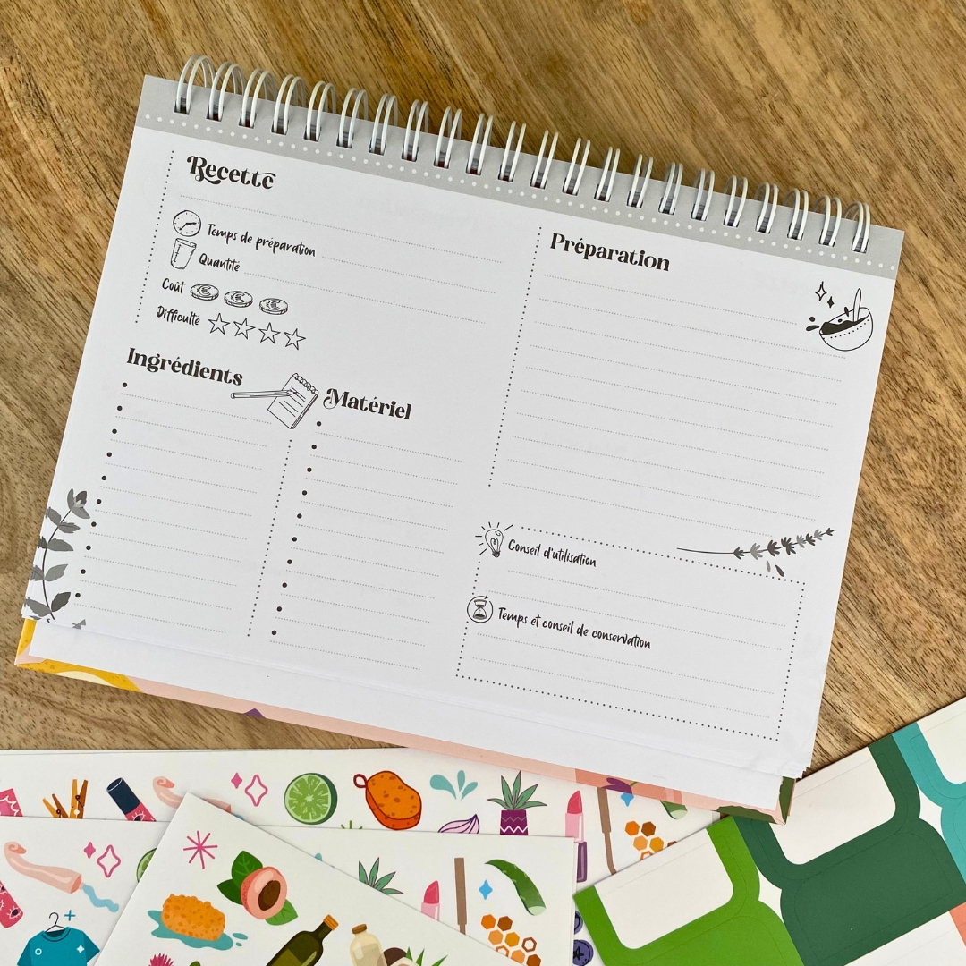 Grâce à ce petit carnet, vous pourrez toutes vos recettes de cosmétiques et d’entretien maison pour les avoir à portée de main.