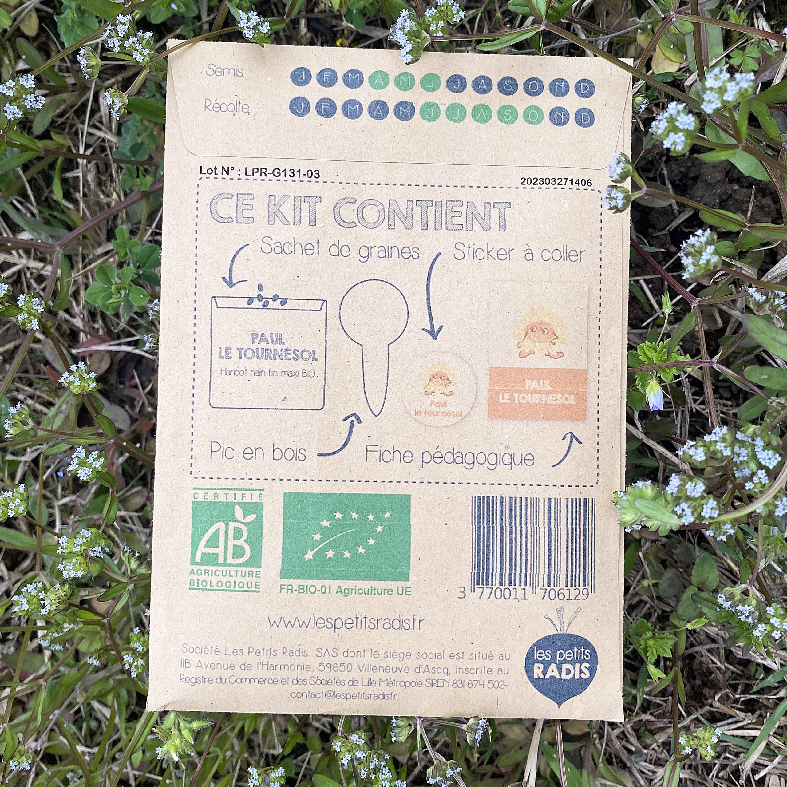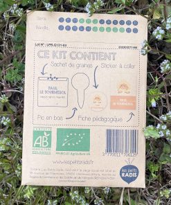 - Un sachet de graines de tournesol bio, – certifiées bio par ECOCERT FR-BIO-01 – contient 25 graines