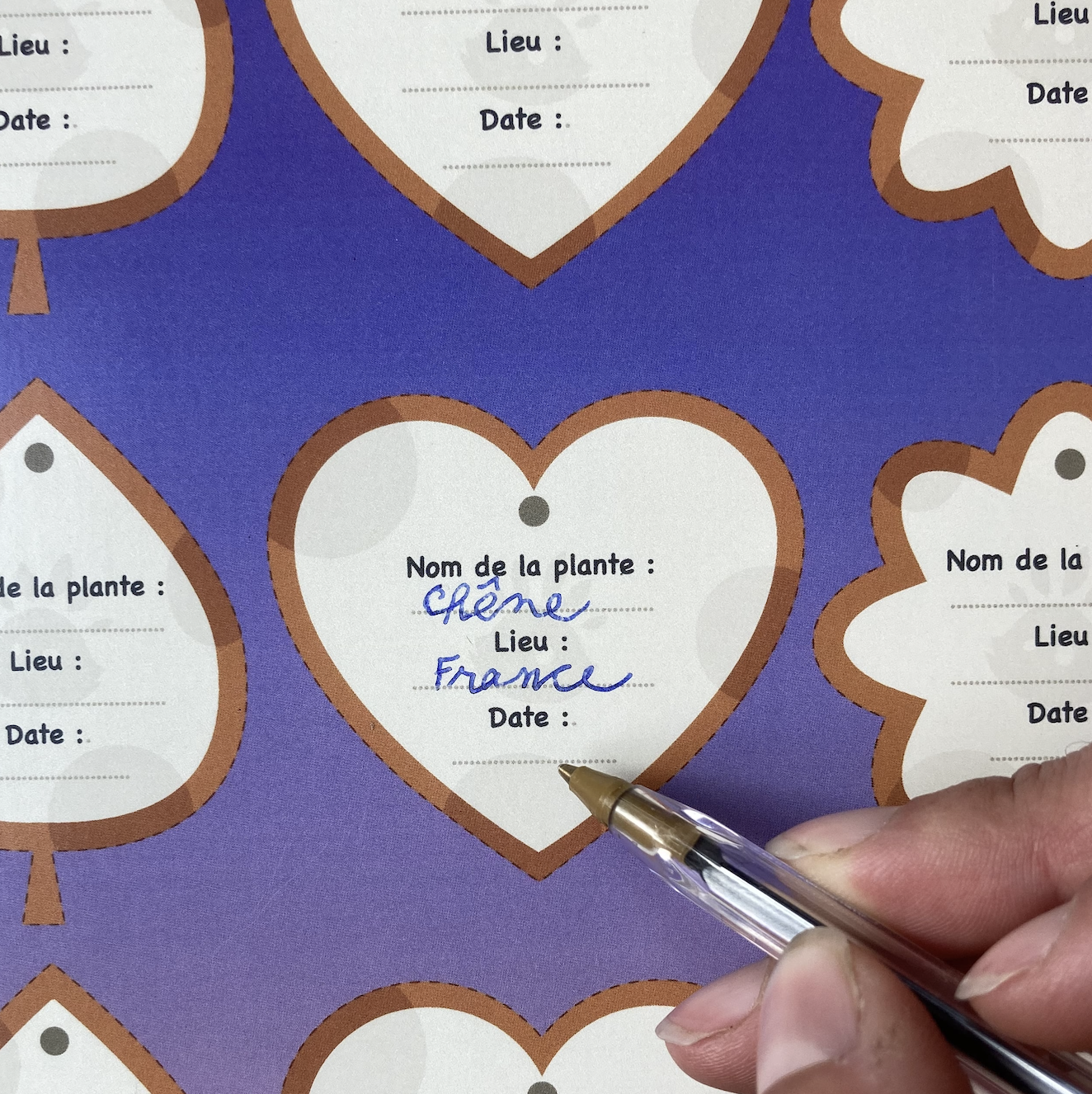 Découpe les étiquettes au dos de la boite afin d’y noter le nom de la fleur récoltée, la date et l’endroit où tu l’a trouvé pour compléter ton herbier.