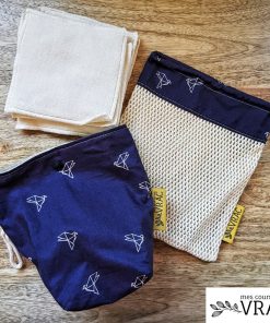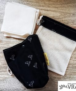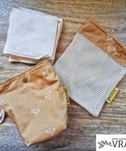Cet ensemble panière + filet & 7 lingettes va transformer votre salle de bain. La panière est doublée en lin enduit pour se laver facilement. On y dépose les lingettes carré toutes douces et bi-faces (une douce et une plus rugueuse). Une fois utilisées, déposez les lingettes dans leur filet de lavage, pour éviter qu’elles ne glissent dans le siphon. Un ensemble élégant, pratique et durable pour une salle de bain zéro-déchet.
