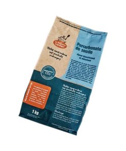 Le percarbonate de soude, ou plutôt percarbonate de sodium, est fabriqué à base de carbonate de sodium (cristaux de soude) additionné de peroxyde d’hydrogène (appelé eau oxygénée). Lorsqu’il est dilué dans de l’eau, il apporte ses propriétés dégraissantes, nettoyantes, antifongiques et blanchissantes. C’est donc un ingrédient multifonction.