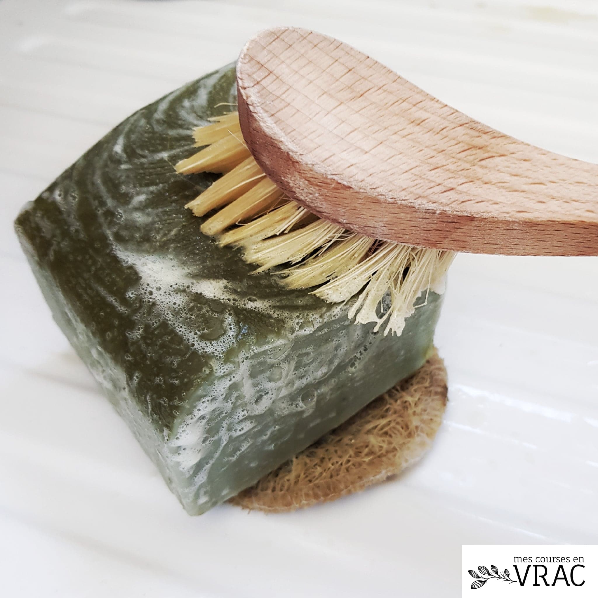 L’astuce Mes courses en vrac : le porte-savon en éponge luffa est idéal en complément du kit-vaisselle composé d’une brosse vaisselle et d’un savon de Marseille. Ce kit permet de faire toute sa vaisselle sans avoir besoin de créer de liquide vaisselle maison.