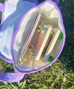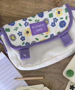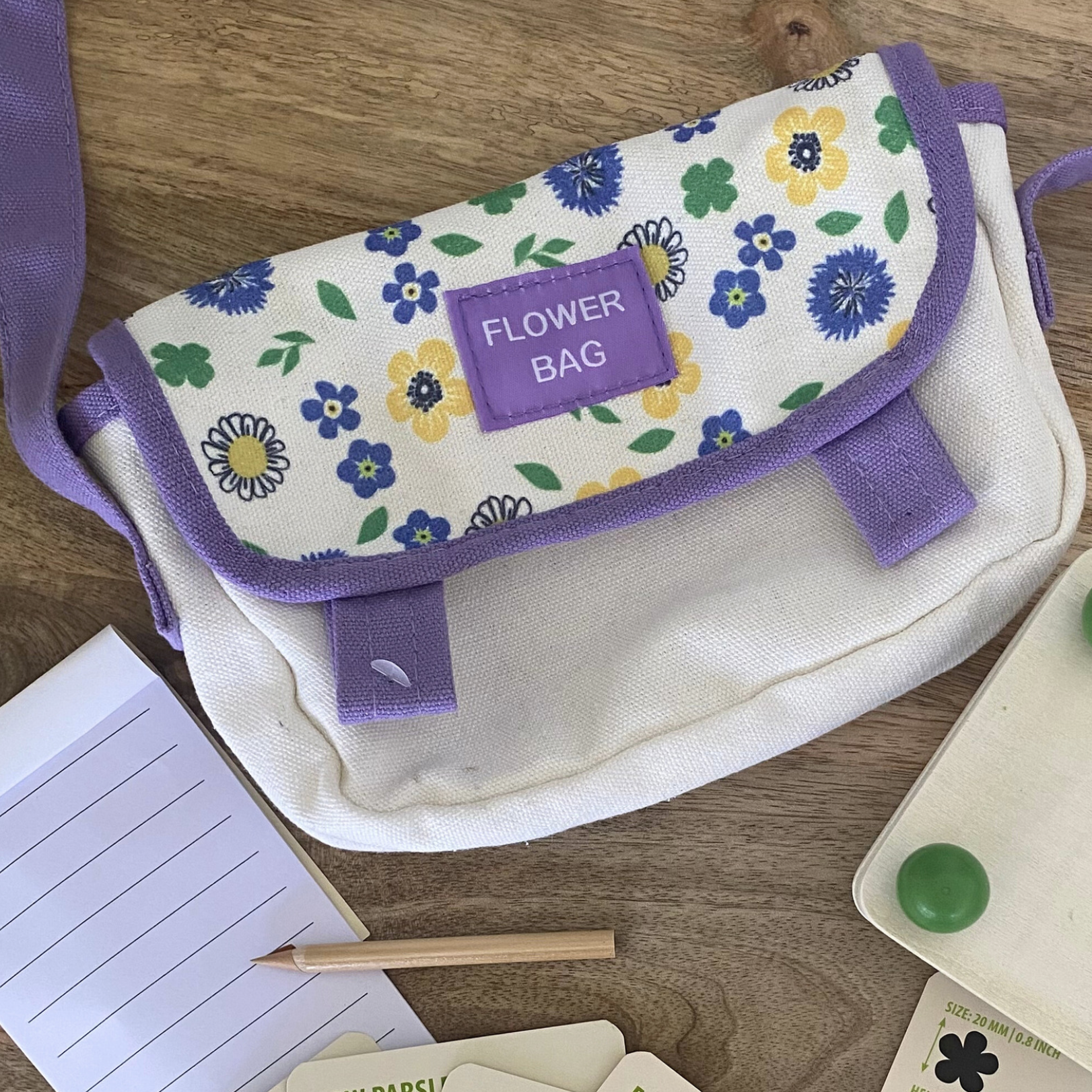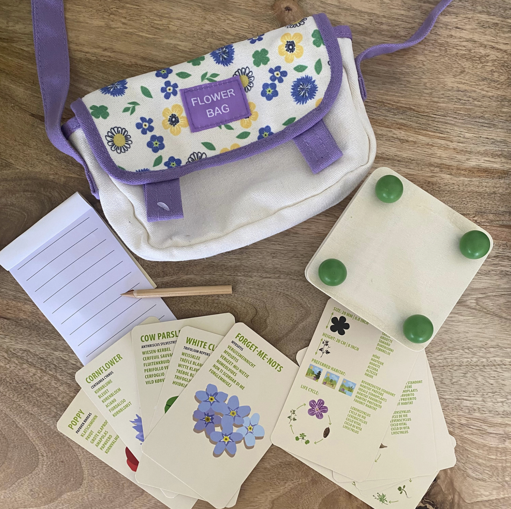 Ce magnifique petit sac lila et crème renferme plein de trésors pour observer les fleurs et en apprendre davantage sur elles.