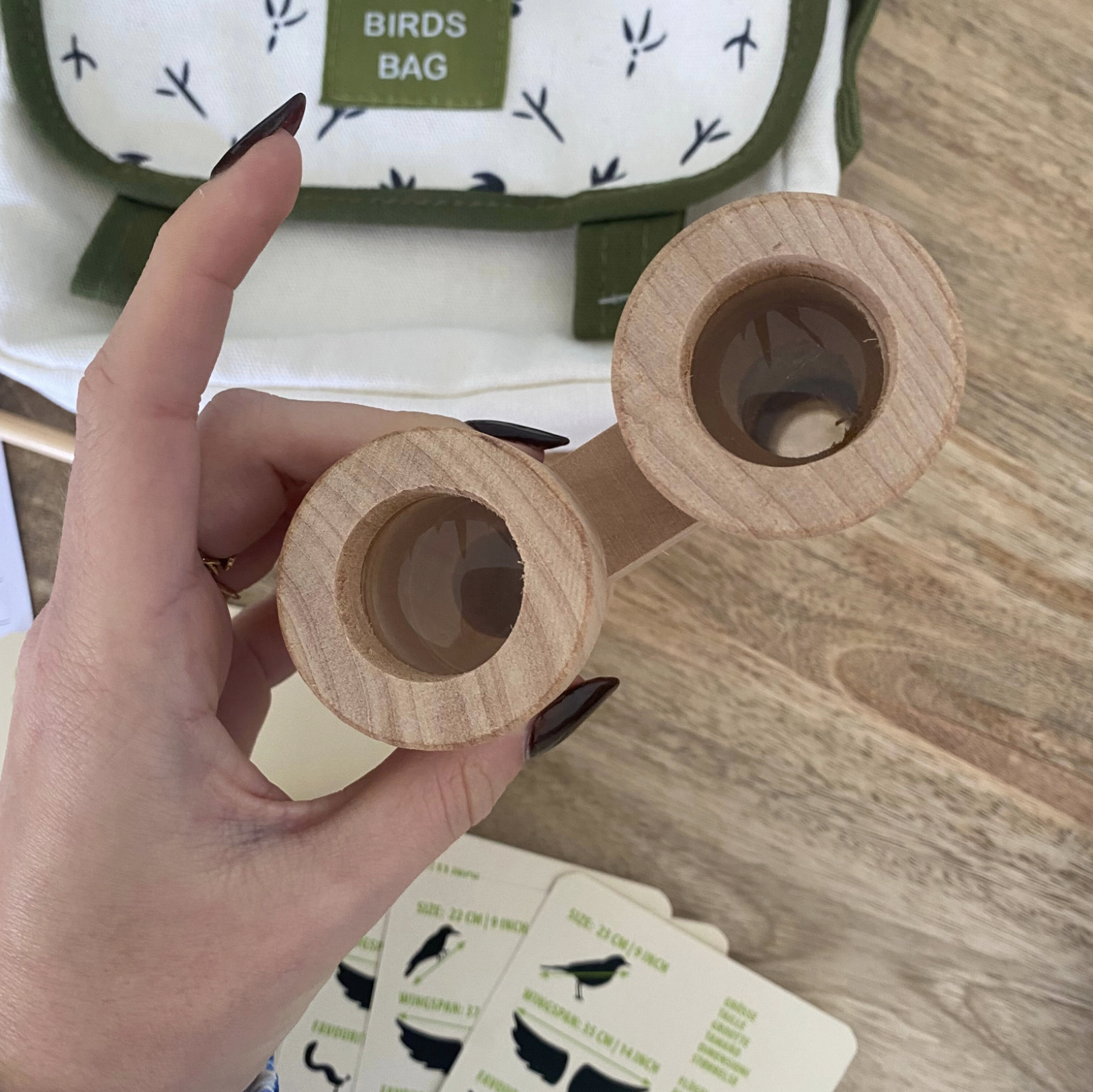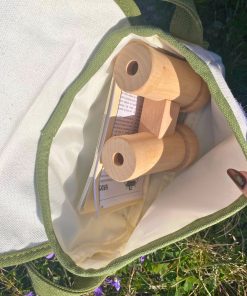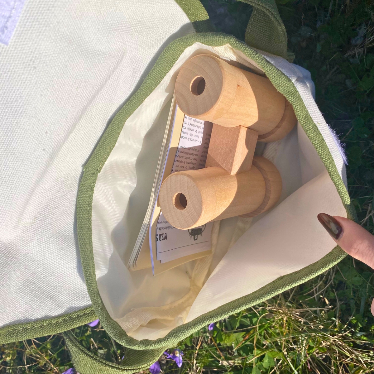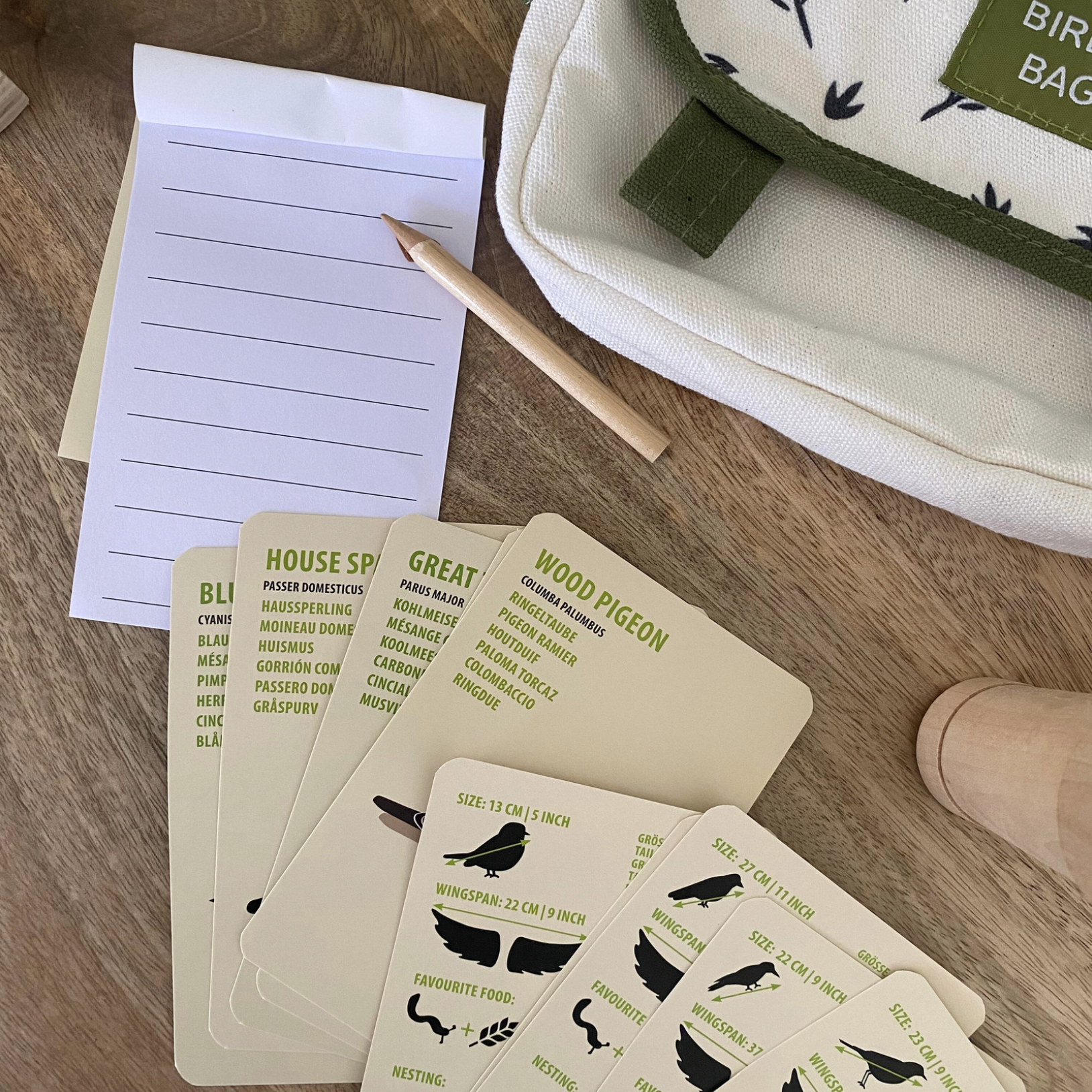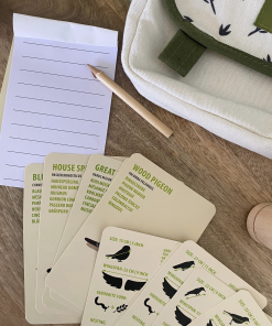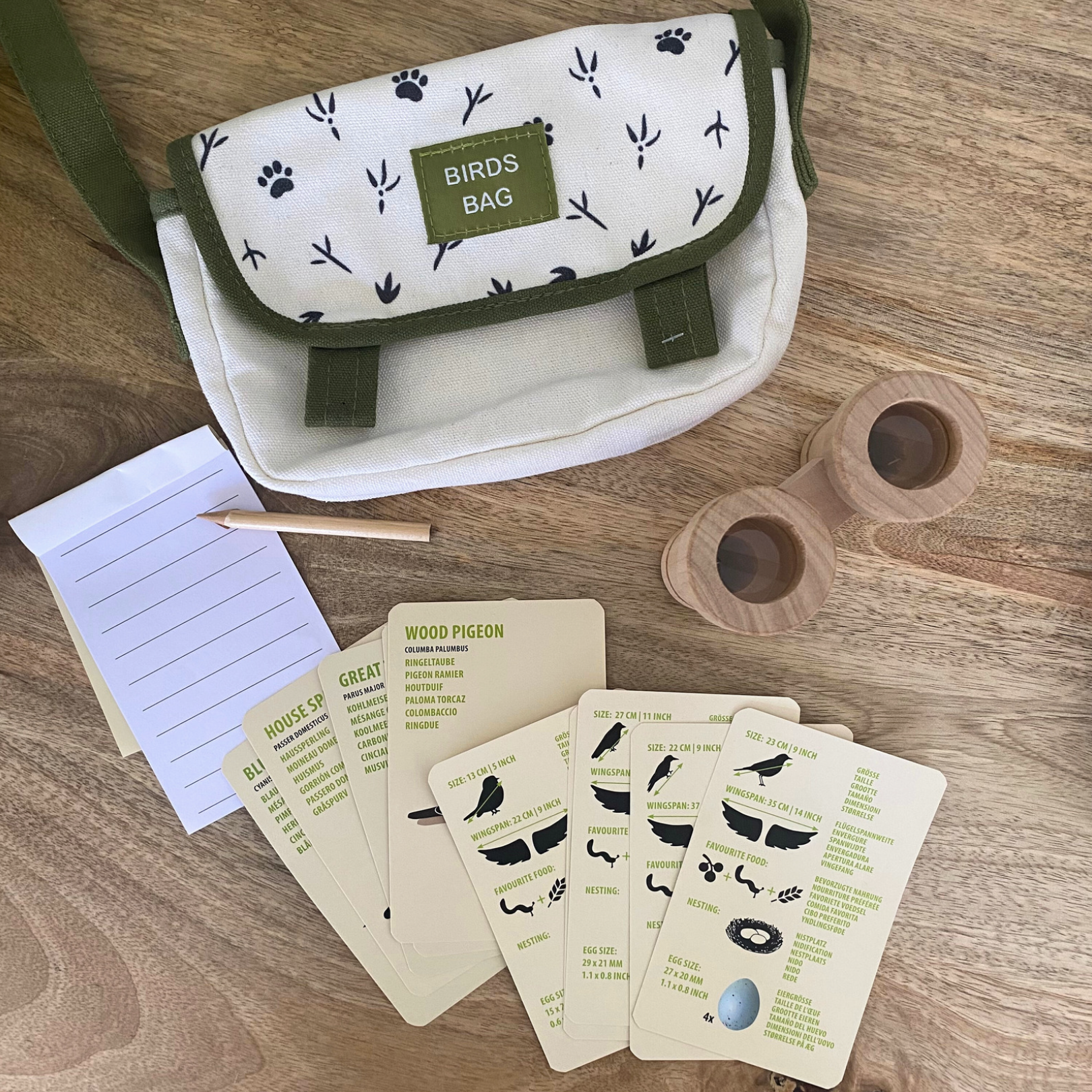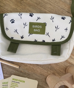 Ce magnifique petit sac kaki et crème renferme plein de trésors pour observer les oiseaux et en apprendre davantage sur chaque espèce.
