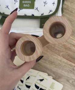 Observez les oiseaux dans le ciel ou dans le jardin à l’aide de la paire de jumelles, prenez des notes dans le petit carnet et retrouvez l’espèce observée dans les cartes oiseaux pour être incollable sur le sujet.