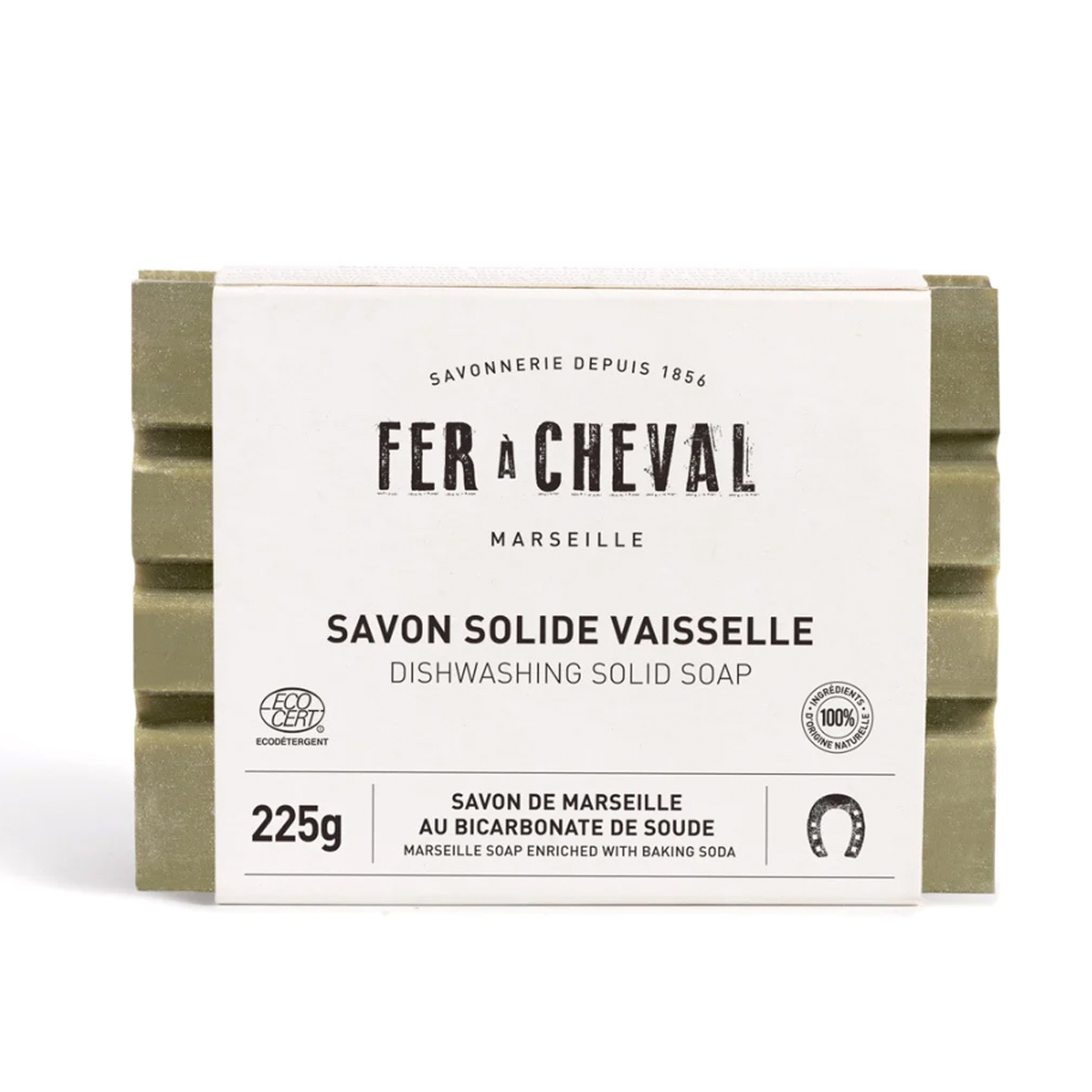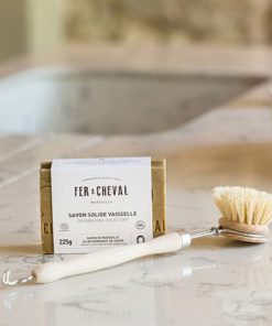 Le Savon Solide Vaisselle Fer à Cheval est élaboré à partir du Savon de Marseille cuit en chaudron et enrichi au Bicarbonate de Soude.