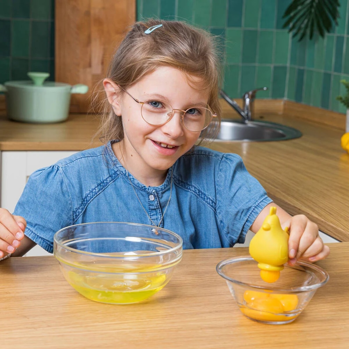 Avec le nouveau séparateur d’œufs en silicone Chefclub Kids, les enfants peuvent facilement séparer les jaunes des blancs en aspirant délicatement le jaune. Inspiré de la poule Colette, cet accessoire ludique rend la cuisine plus accessible, favorisant ainsi leur autonomie et leur plaisir dans la préparation des repas ! Avec une simple pression, le jaune est aspiré sans se casser, finis les œufs gâchés. Colette saura les couver jusqu’au saladier !
